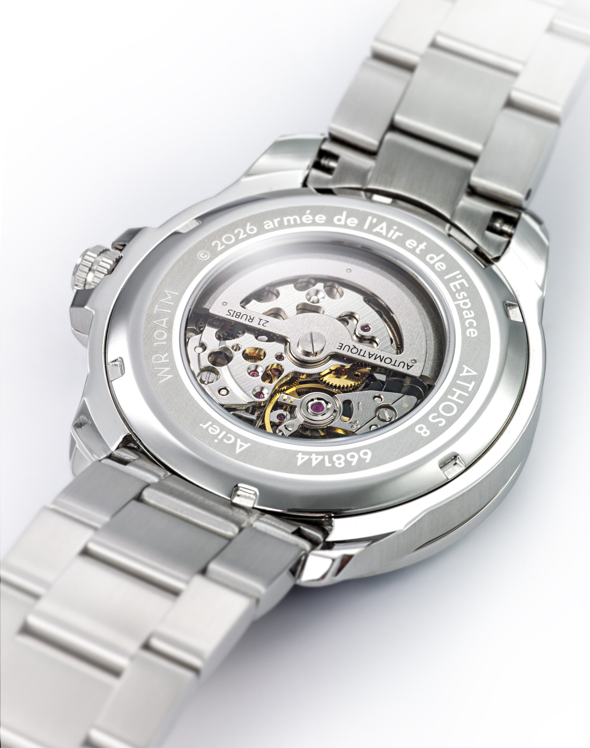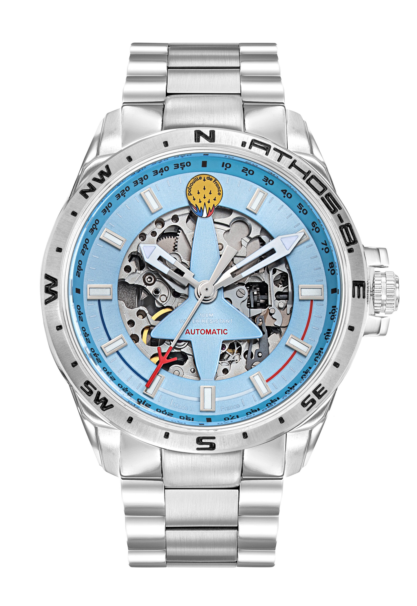 La découpe d’un Alphat Jet sur le cadran de notre Montre Automatique Acier Cadran Bleu Clair A8-100ED-668144 fait écho aux avions profilés de la PAF. Cette montre de haute voltige laisse entrevoir son mouvement automatique 21 rubis. Un mécanisme automatique pour avoir toujours un coup d’avance.